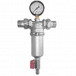 Фильтр механической очистки воды с возможностью удаления накопившихся загрязнений без извлечения сетчатых вставок. Предусмотрены дренажный шаровой кран со штуцером для подключения шланга и манометр для контроля уровня загрязненности фильтра. Фильтр монтируется вертикально, колбой вниз.